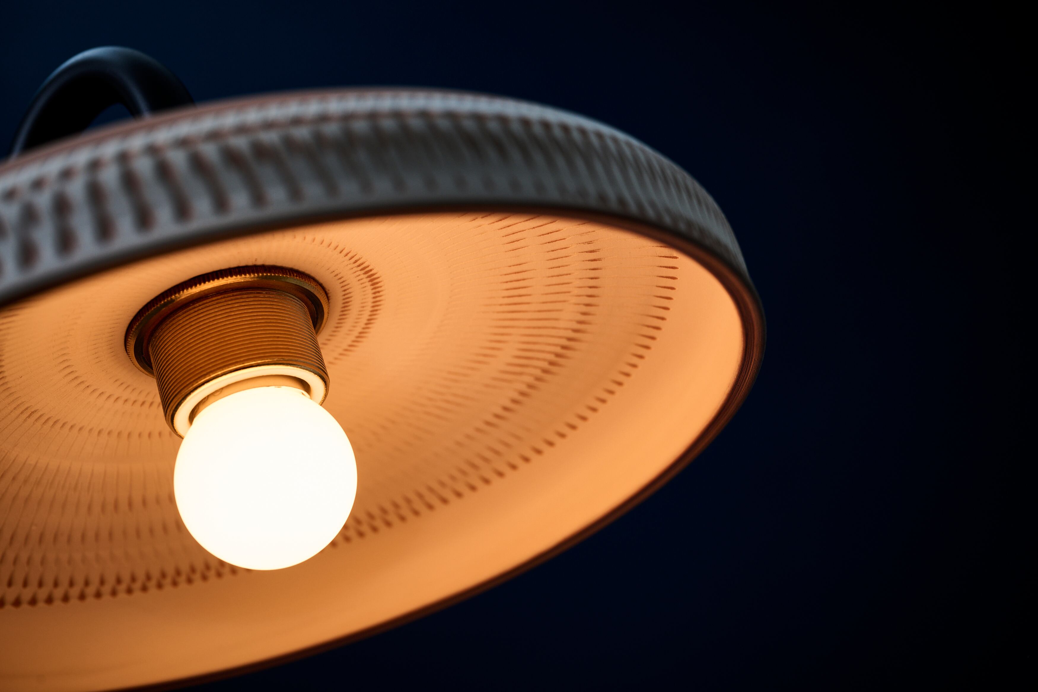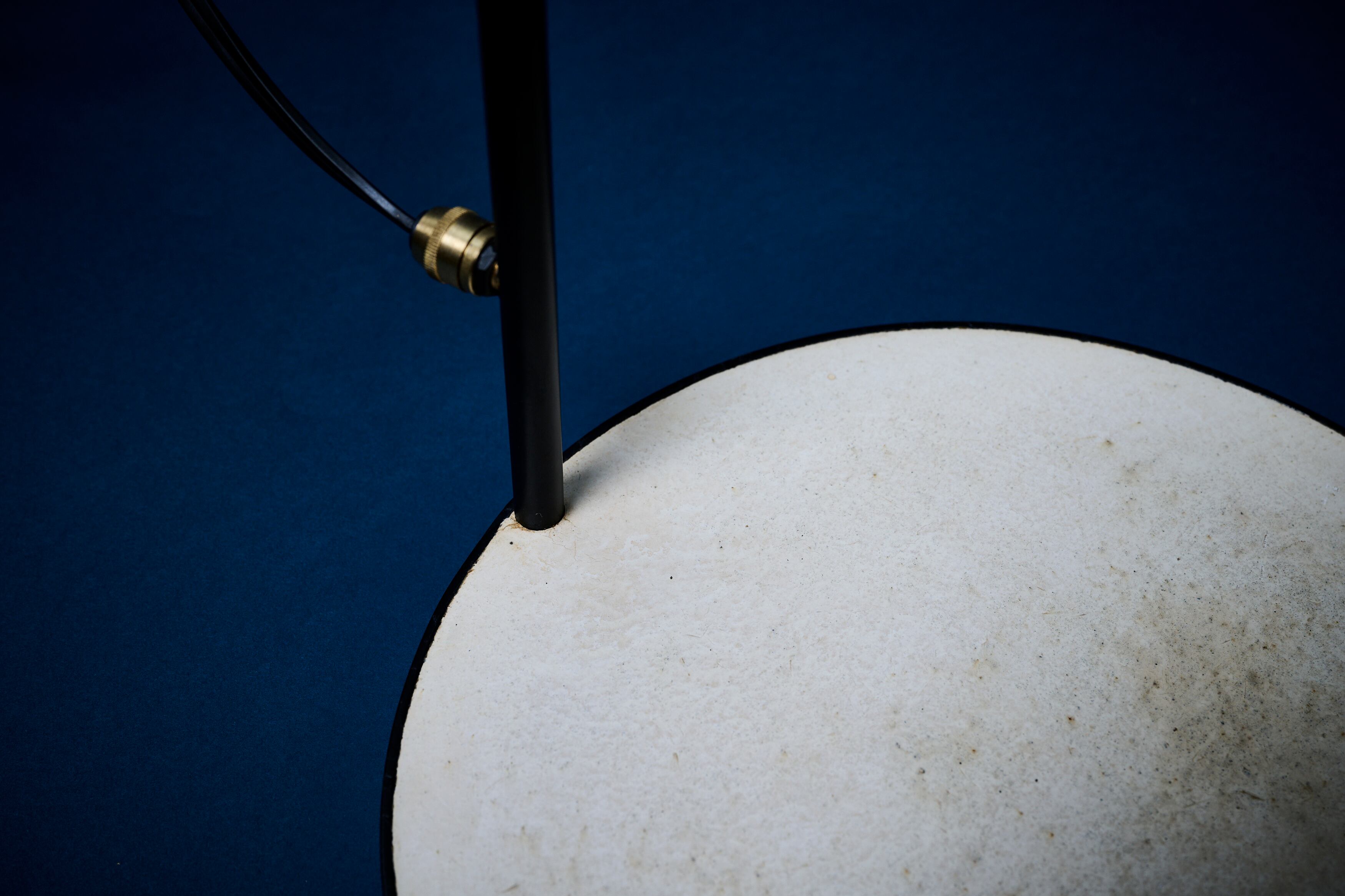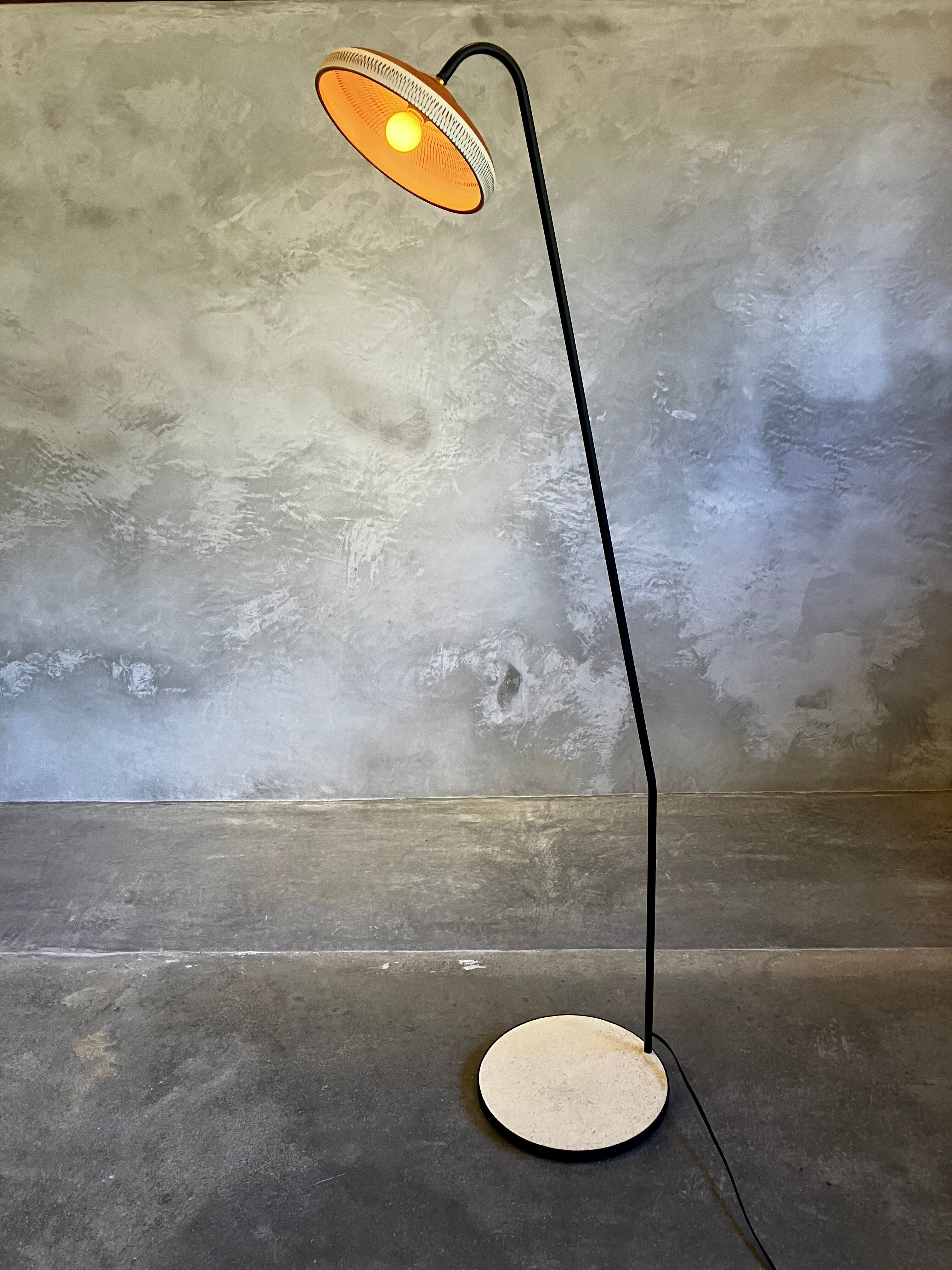 小鹿田焼の唐臼から着想を得たフロアスタンド。鉄の支柱は唐臼の形をイメージして試作を重ねていくうちにシンプルな形にたどり着きました。ライトの台座には唐臼の下にある粉砕された陶土や川の石や小鹿田焼の残土を利用し、左官職人が伝統工法を用いて仕上げの風合いを追求しました。照明の灯りを眺めていると唐臼のある小鹿田の風景が思い浮かびます。