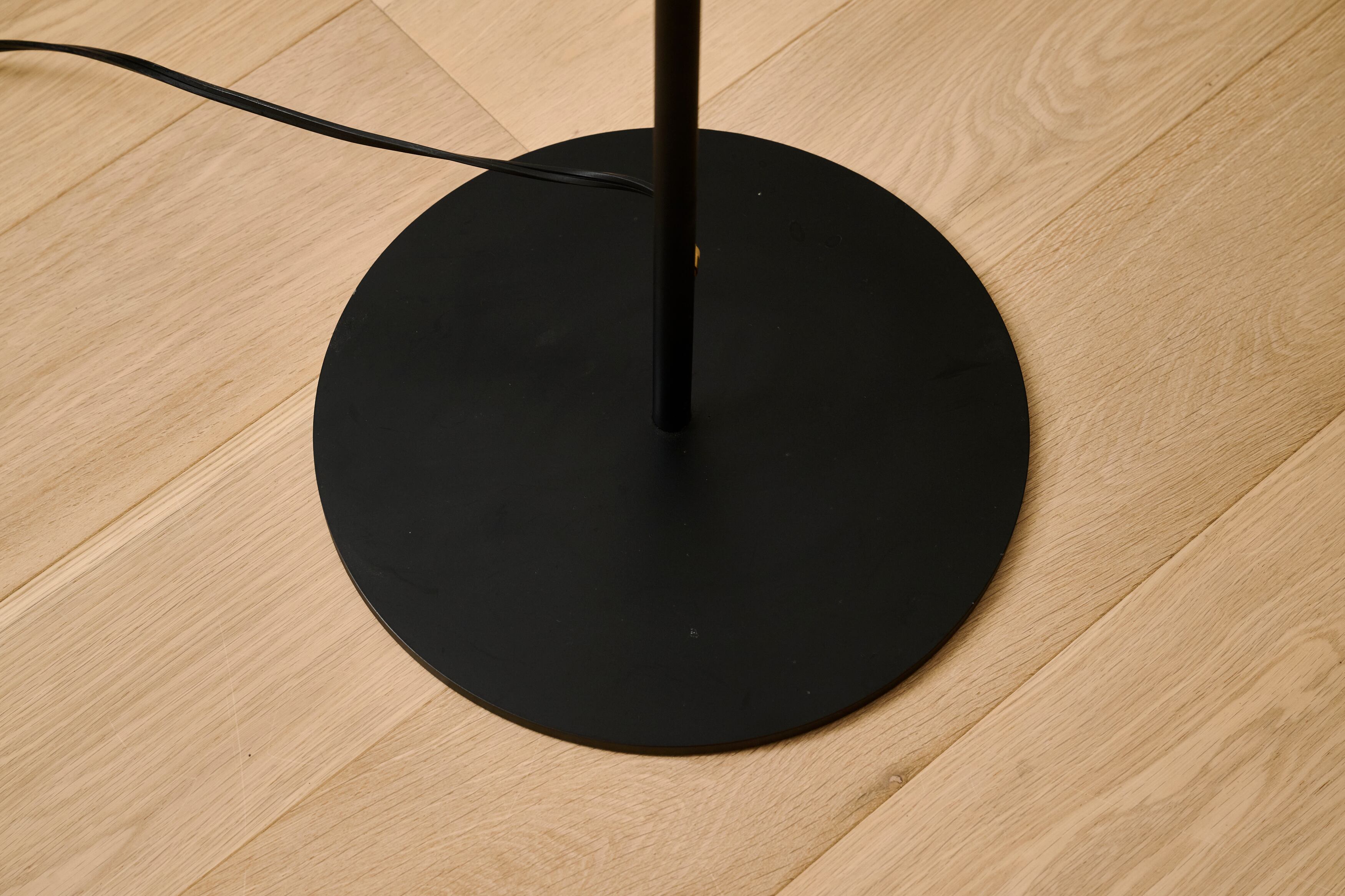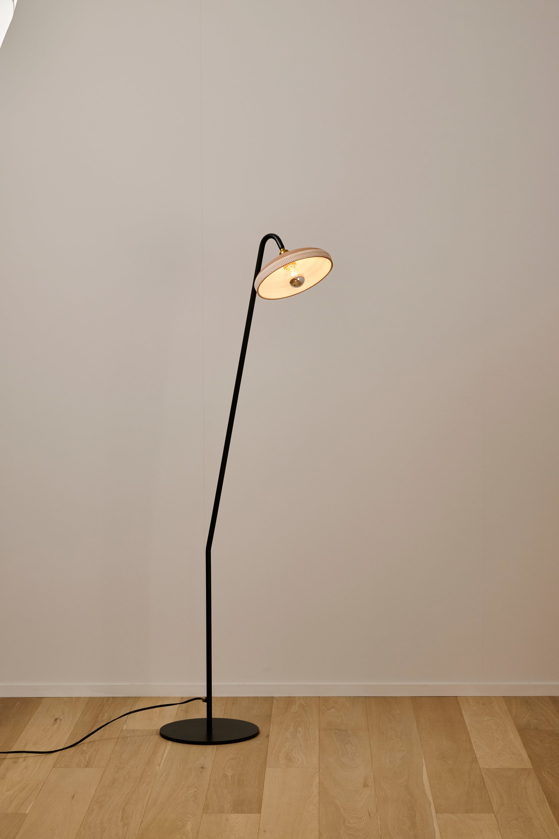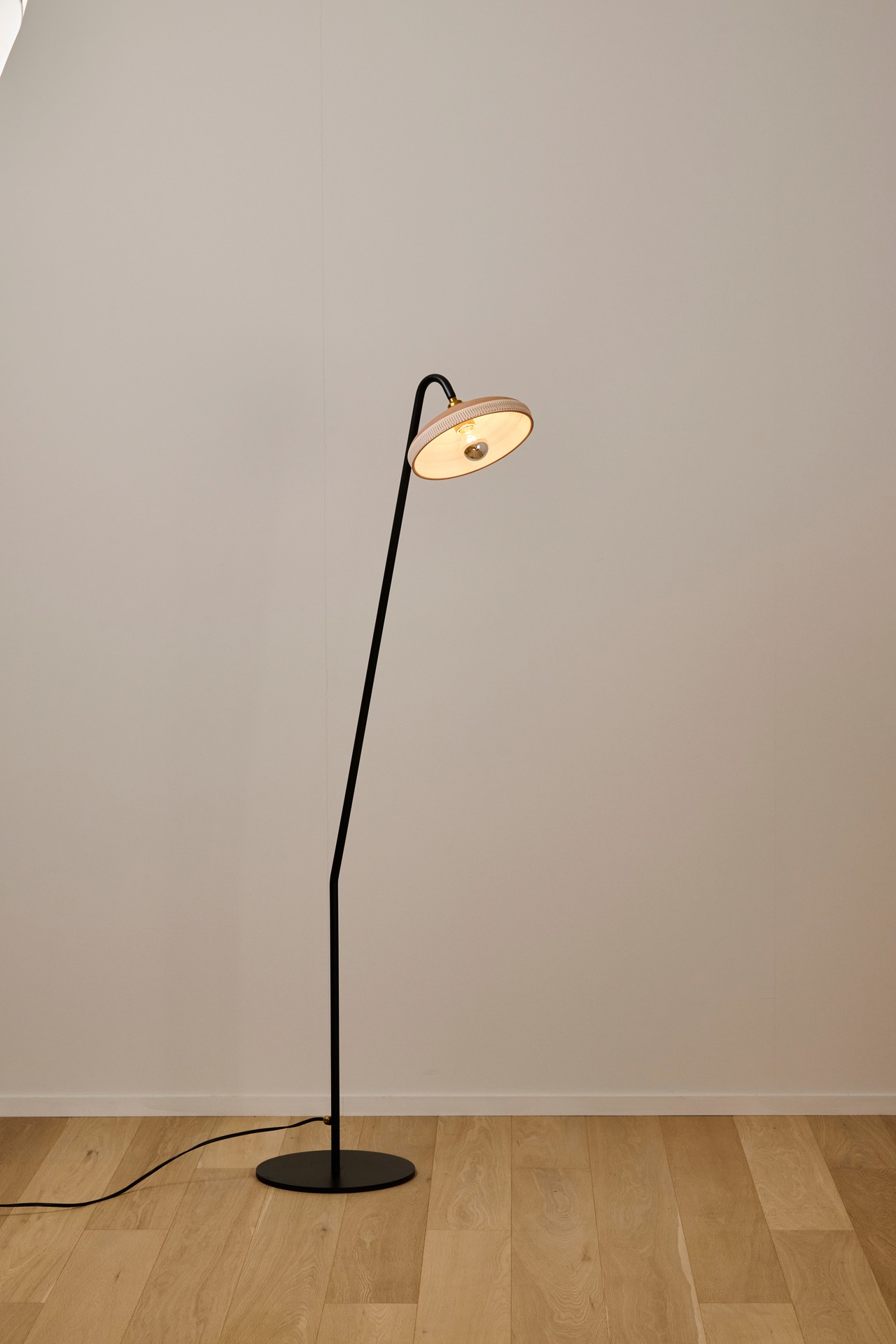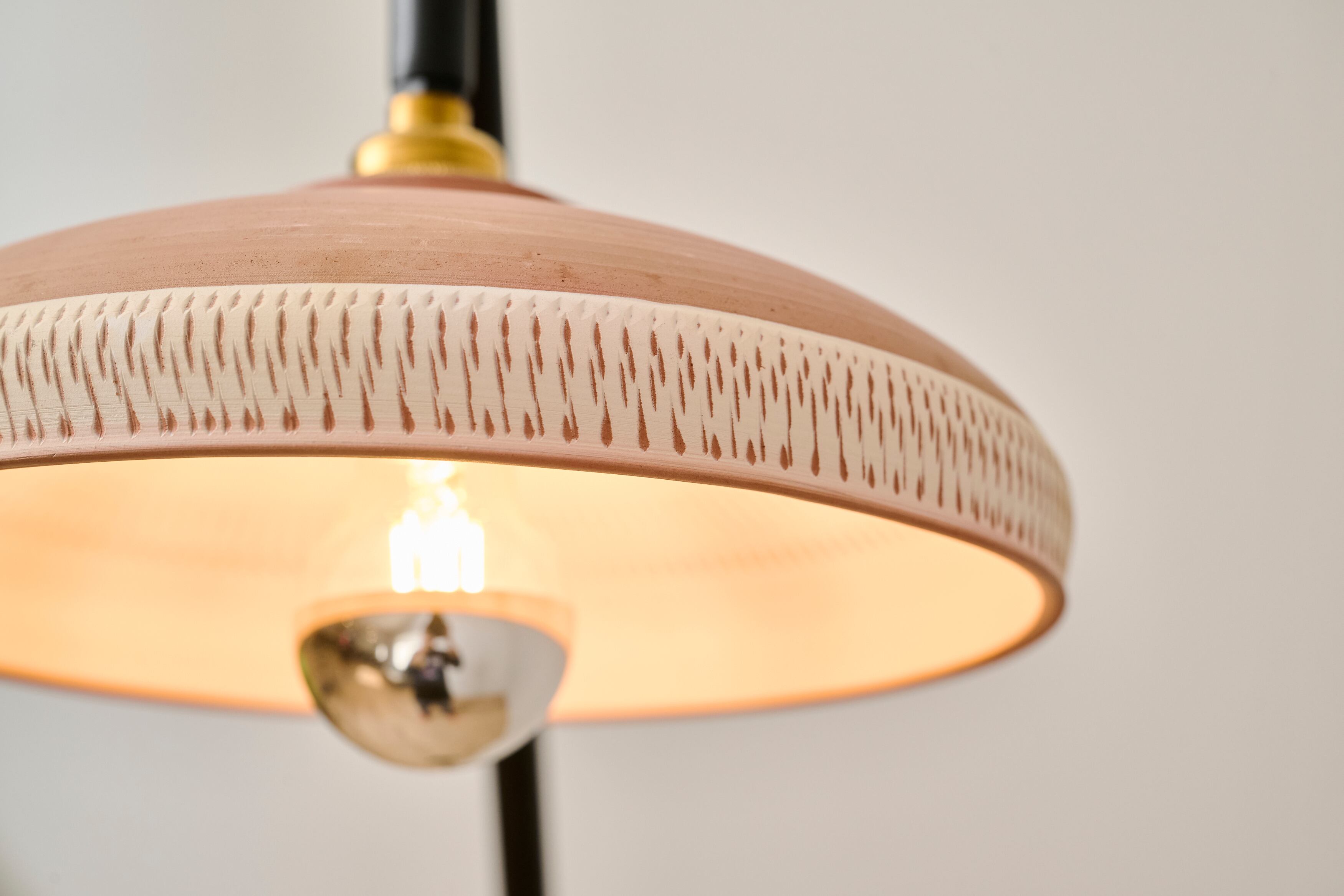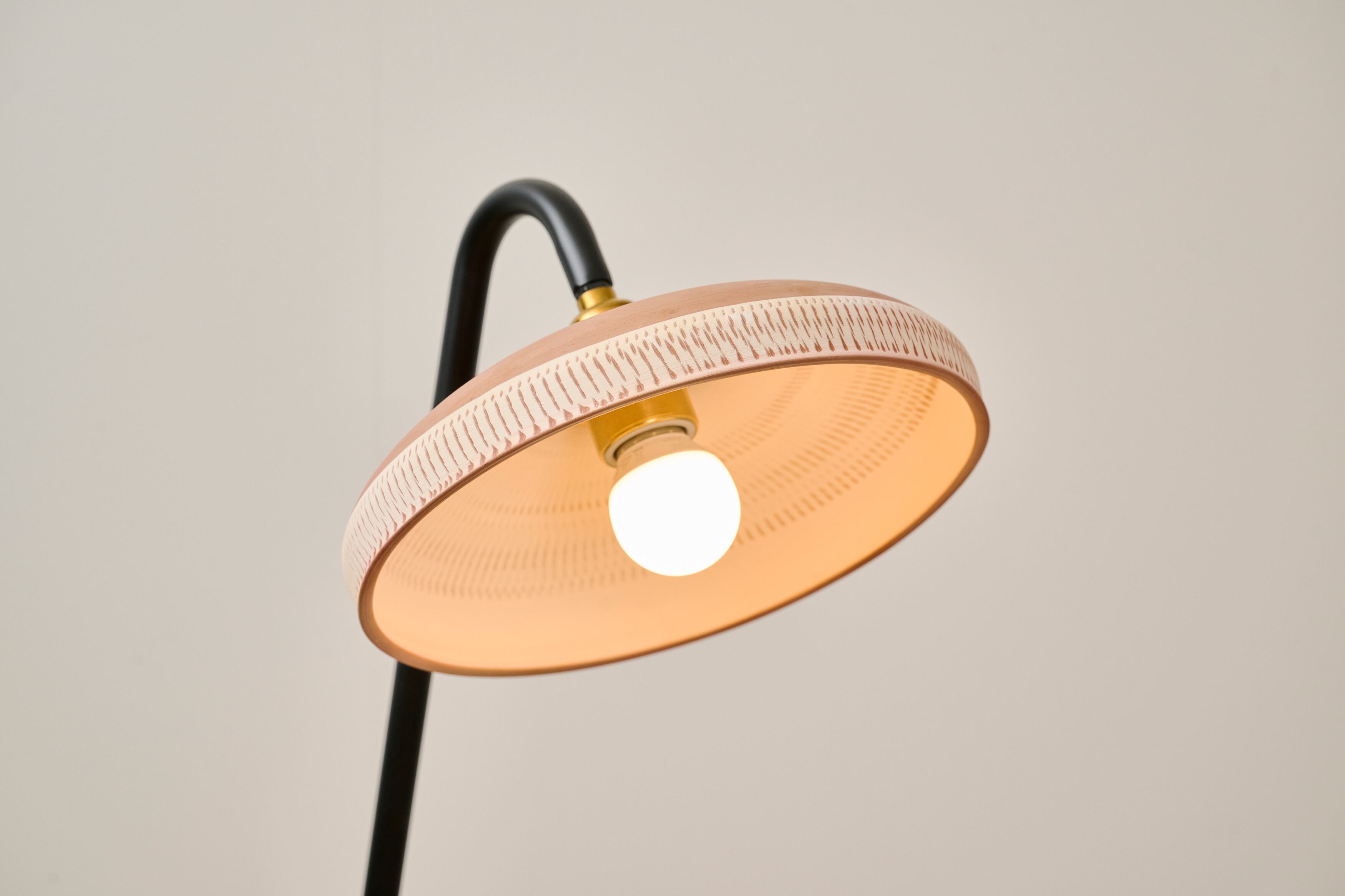 小鹿田焼の唐臼から着想を得たフロアスタンド。鉄の支柱は唐臼の形をイメージして試作を重ねていくうちにシンプルな形にたどり着きました。照明の灯りを眺めていると唐臼のある小鹿田の風景が思い浮かびます。