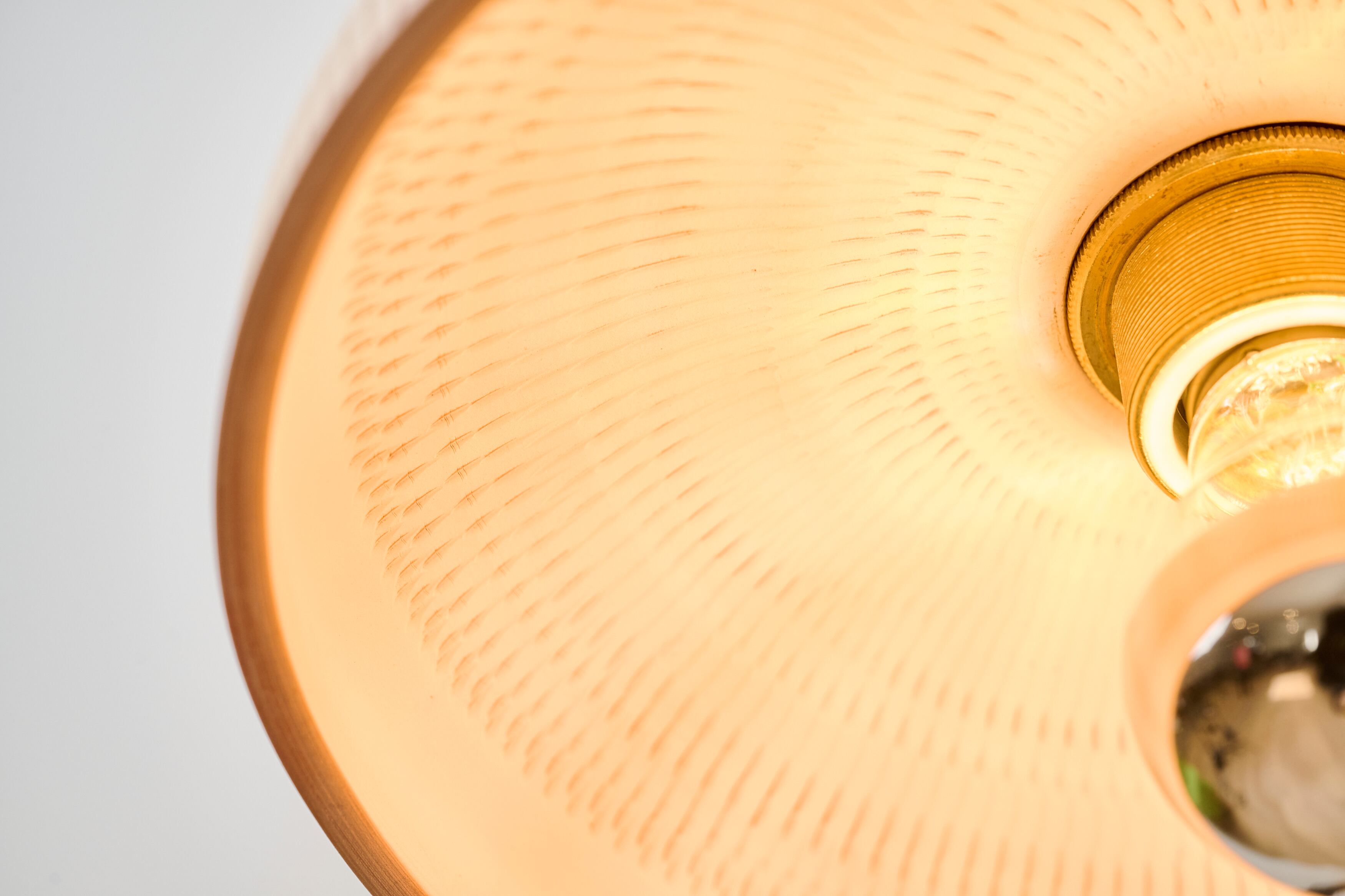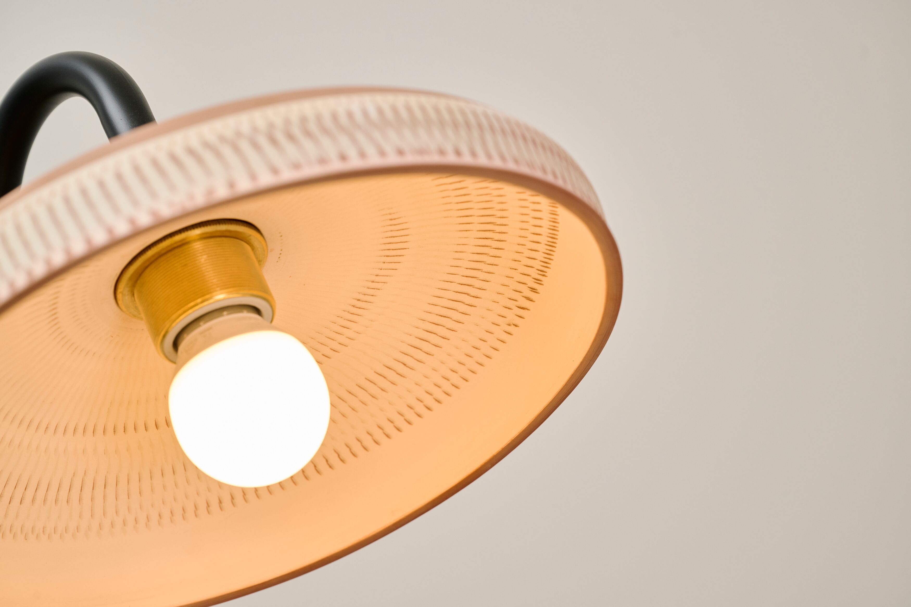 小鹿田焼の唐臼から着想を得たフロアスタンド。鉄の支柱は唐臼の形をイメージして試作を重ねていくうちにシンプルな形にたどり着きました。照明の灯りを眺めていると唐臼のある小鹿田の風景が思い浮かびます。