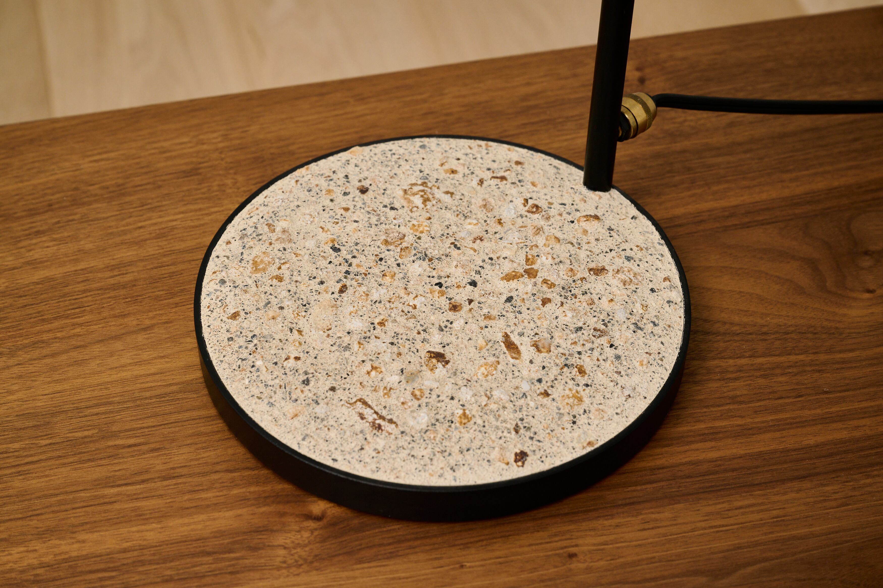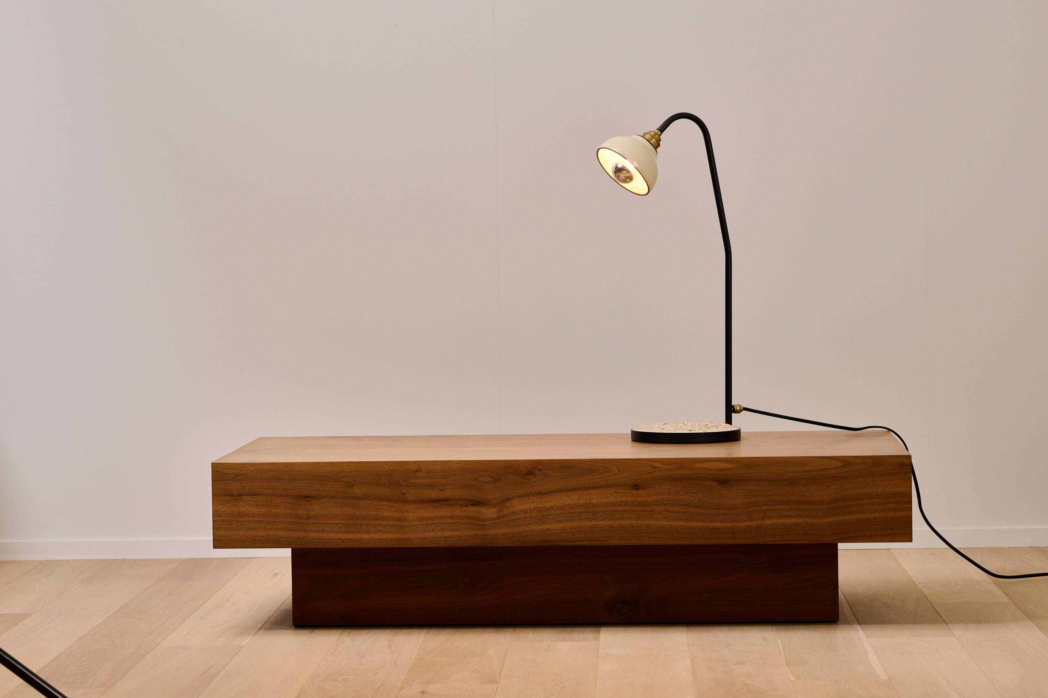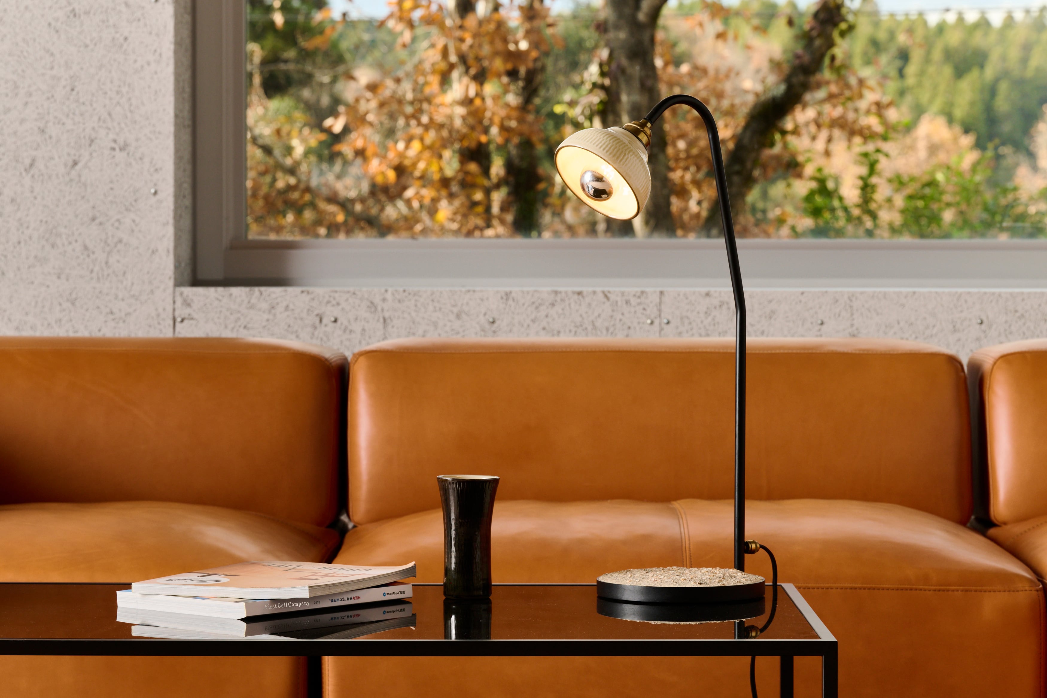 小鹿田焼の唐臼から着想を得たデスクスタンド。鉄の支柱は唐臼の形をイメージして試作を重ねていくうちにシンプルな形にたどり着きました。ライトの台座には唐臼の下にある粉砕された陶土や川の石や小鹿田焼の残土を利用し、左官職人が伝統工法を用いて仕上げの風合いを追求しました。照明の灯りを眺めていると唐臼のある小鹿田の風景が思い浮かびます。