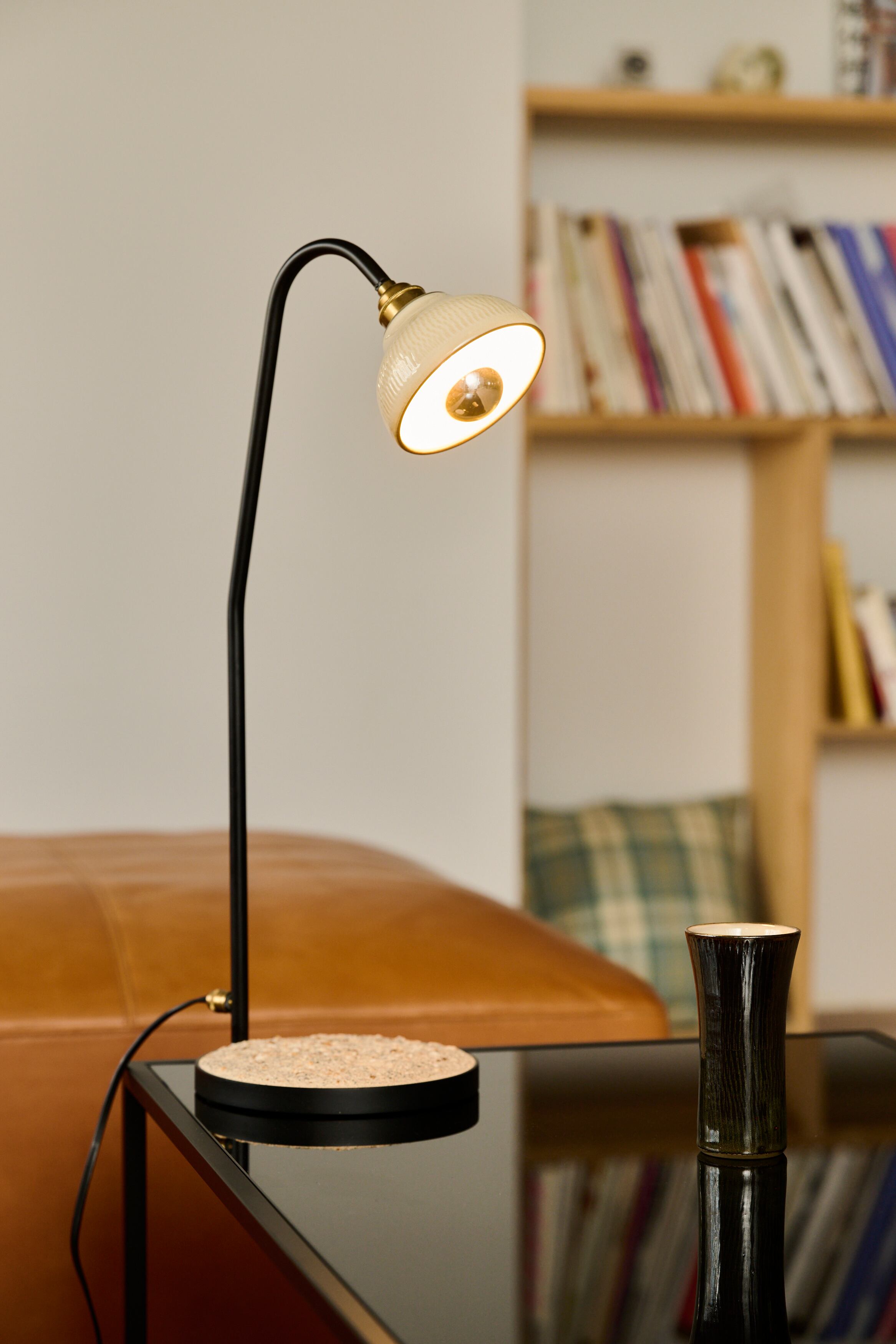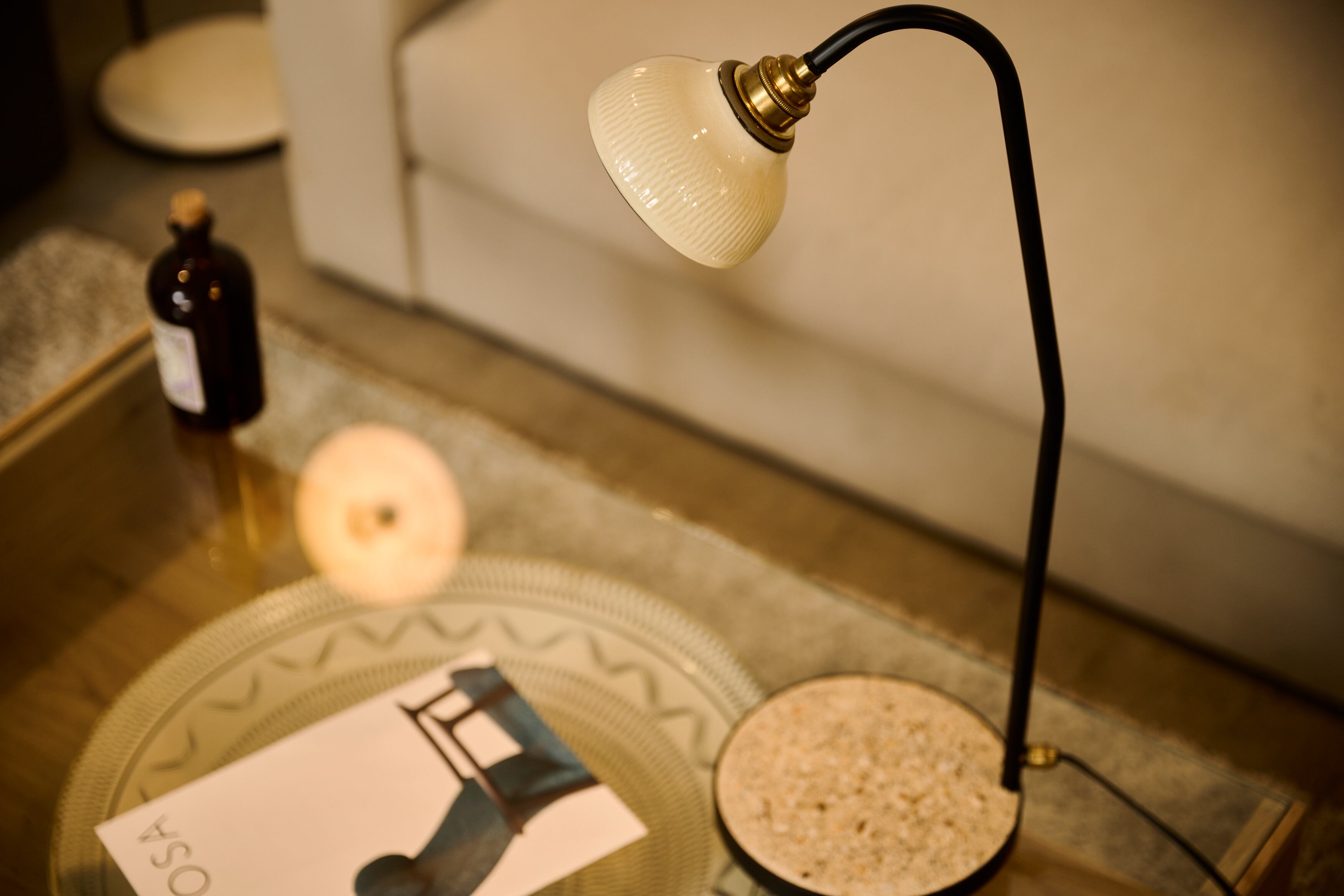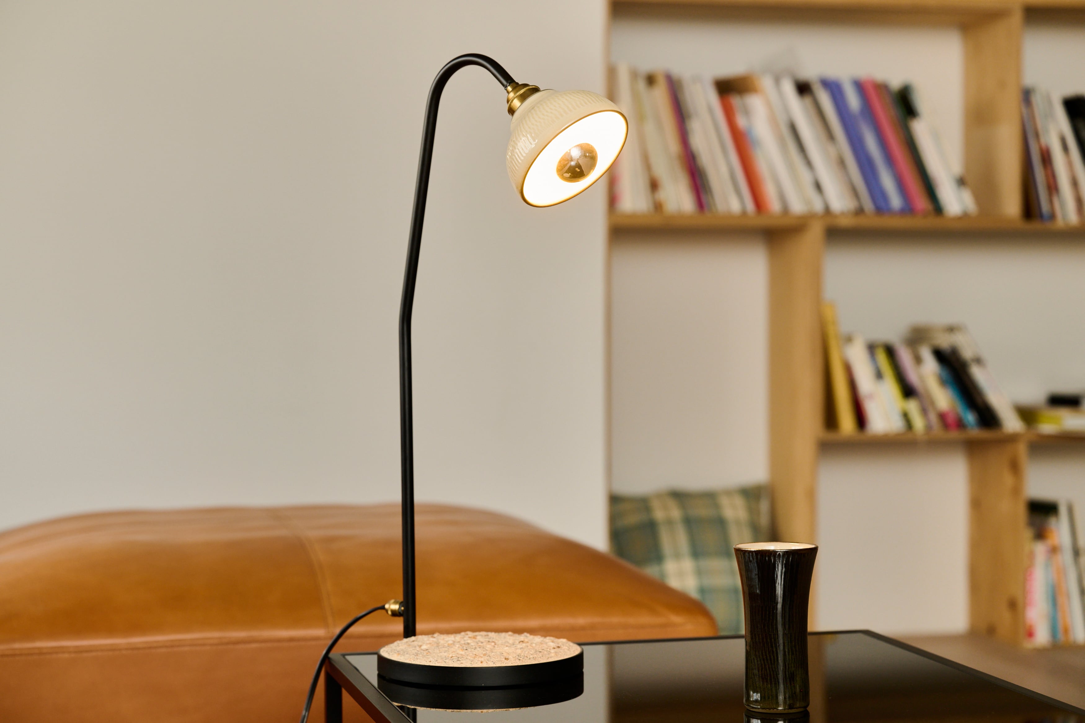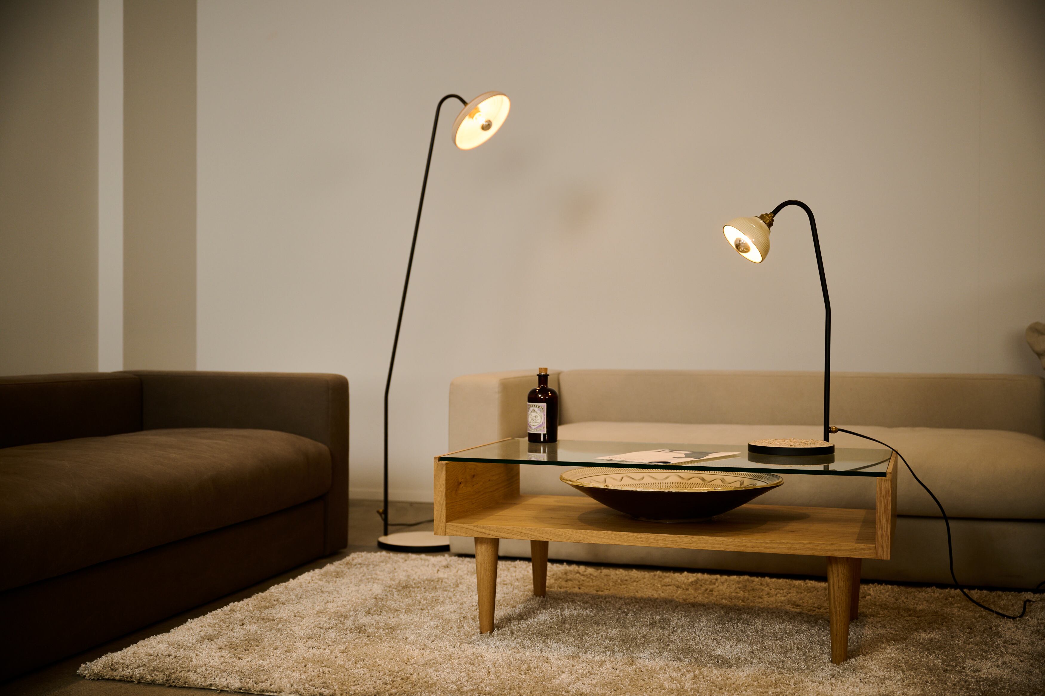 小鹿田焼の唐臼から着想を得たデスクスタンド。鉄の支柱は唐臼の形をイメージして試作を重ねていくうちにシンプルな形にたどり着きました。ライトの台座には唐臼の下にある粉砕された陶土や川の石や小鹿田焼の残土を利用し、左官職人が伝統工法を用いて仕上げの風合いを追求しました。照明の灯りを眺めていると唐臼のある小鹿田の風景が思い浮かびます。