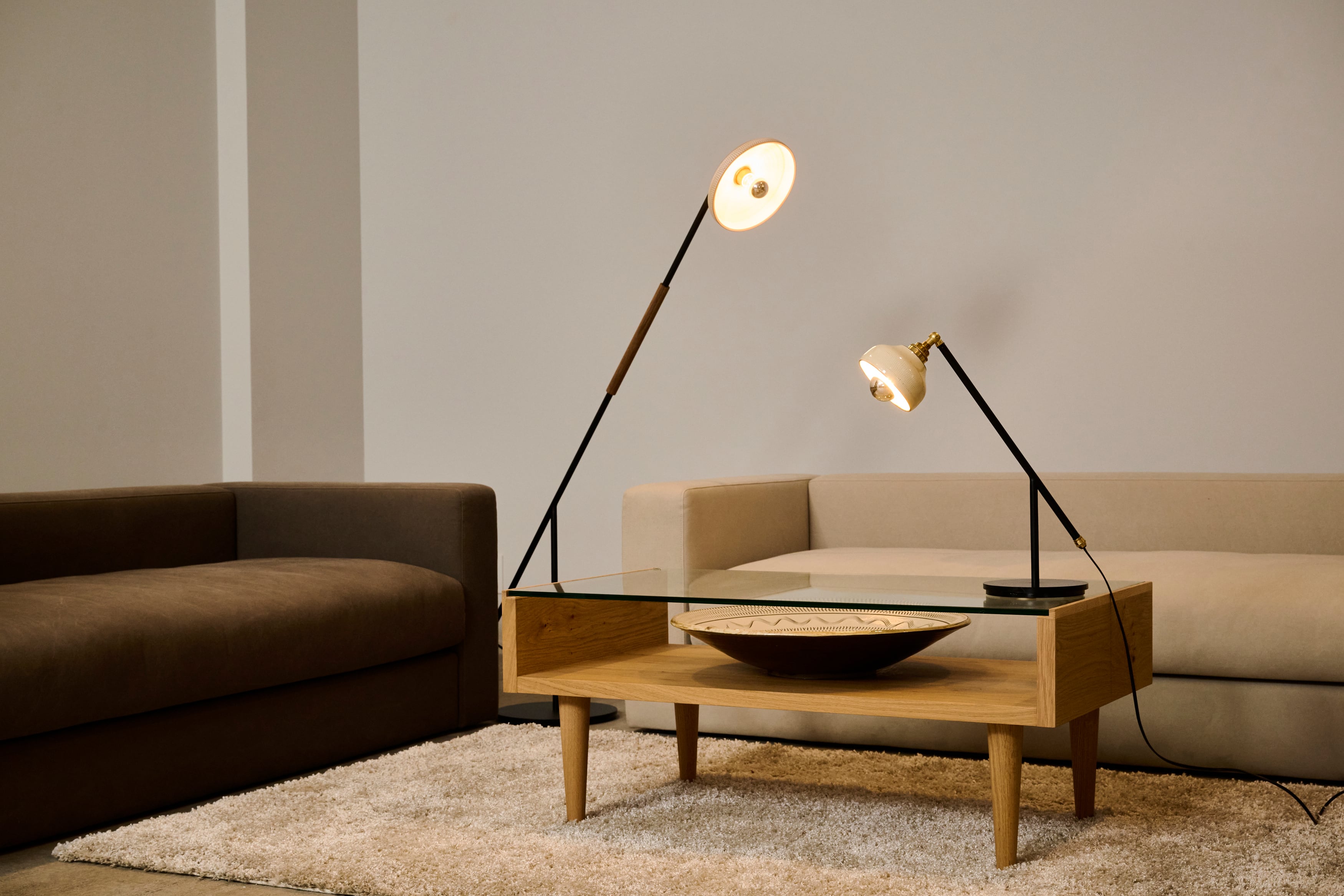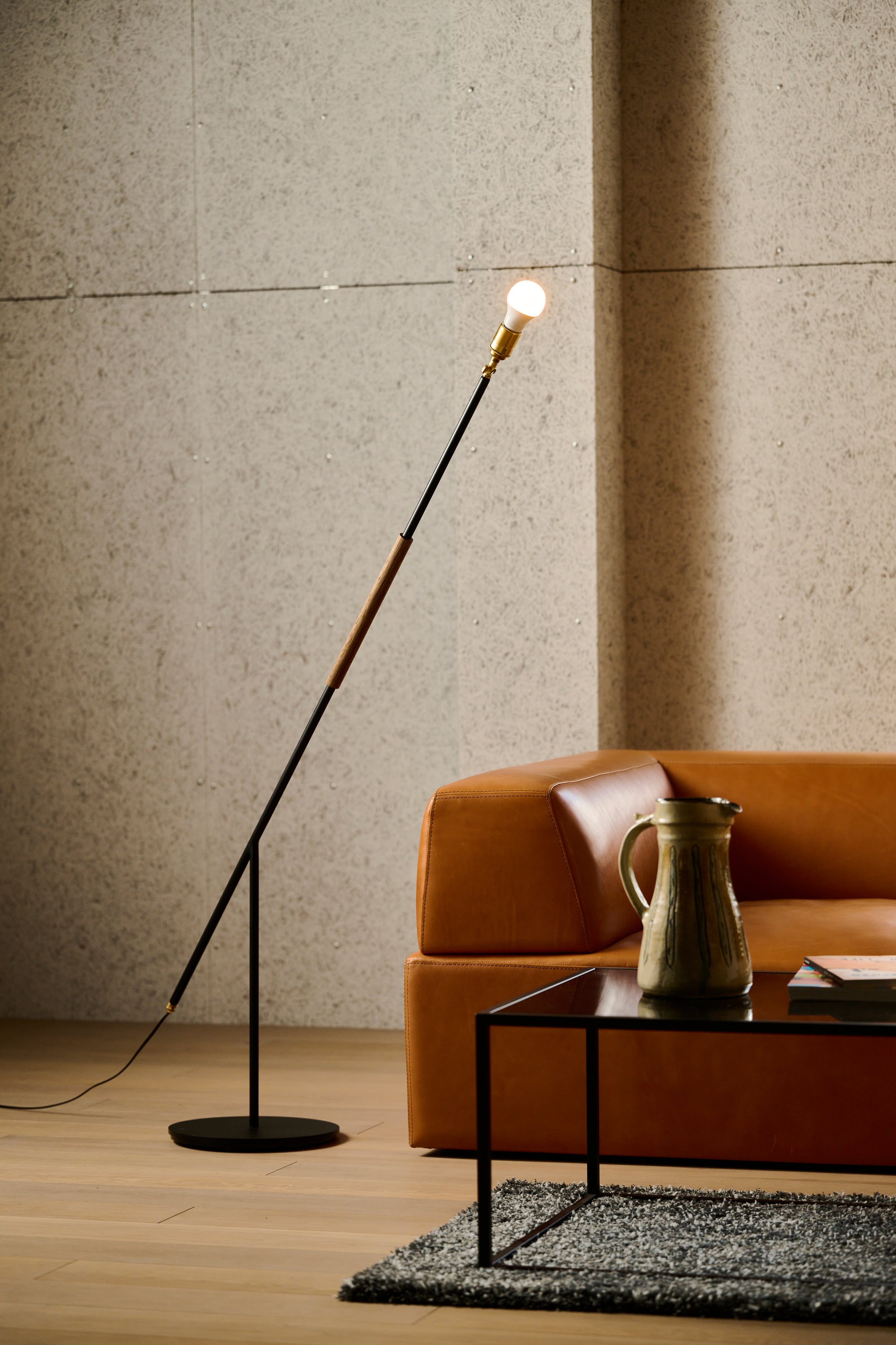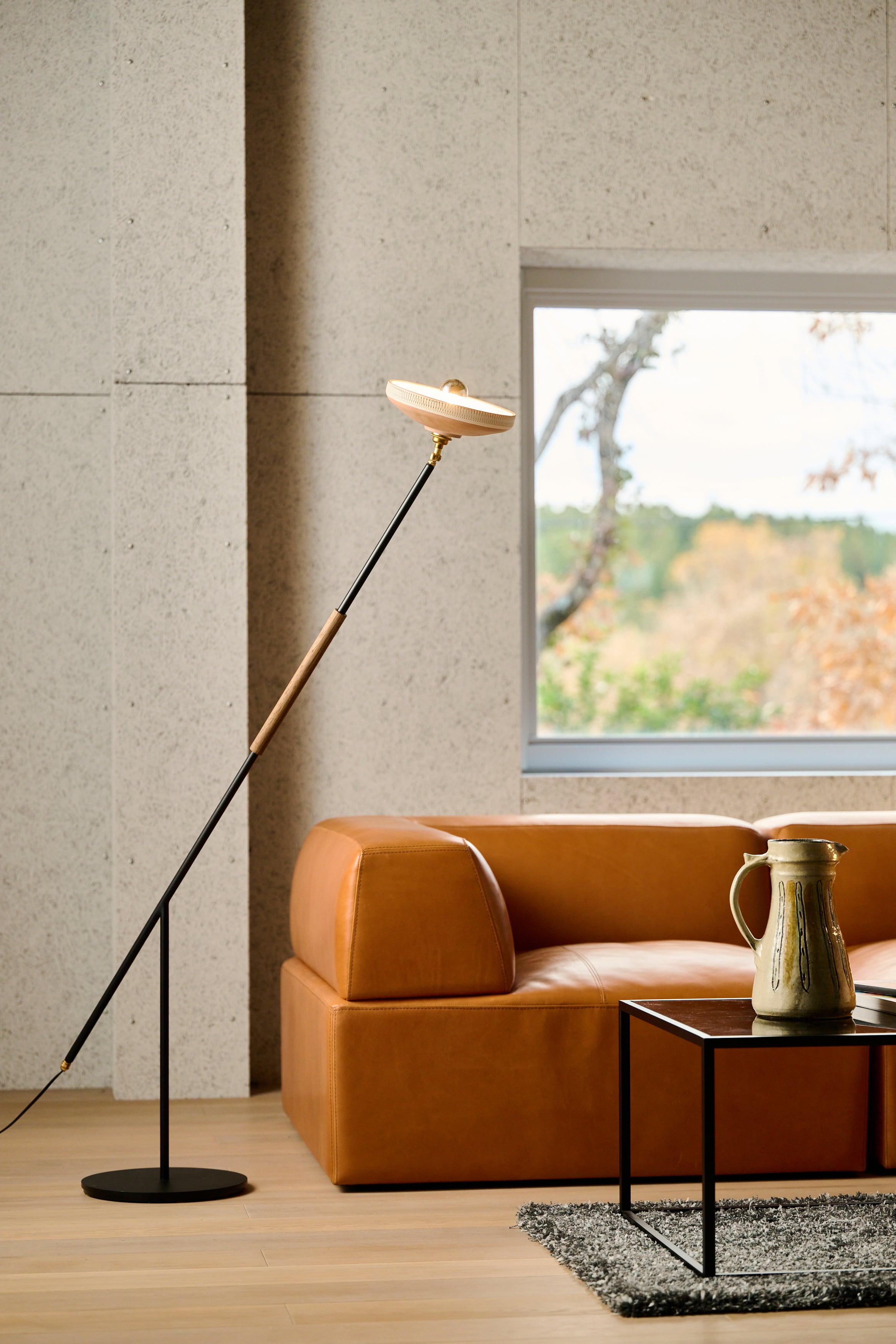 小鹿田焼の唐臼から着想を得たフロアスタンド。照明の灯りを眺めていると唐臼のある小鹿田の風景が思い浮かびます。