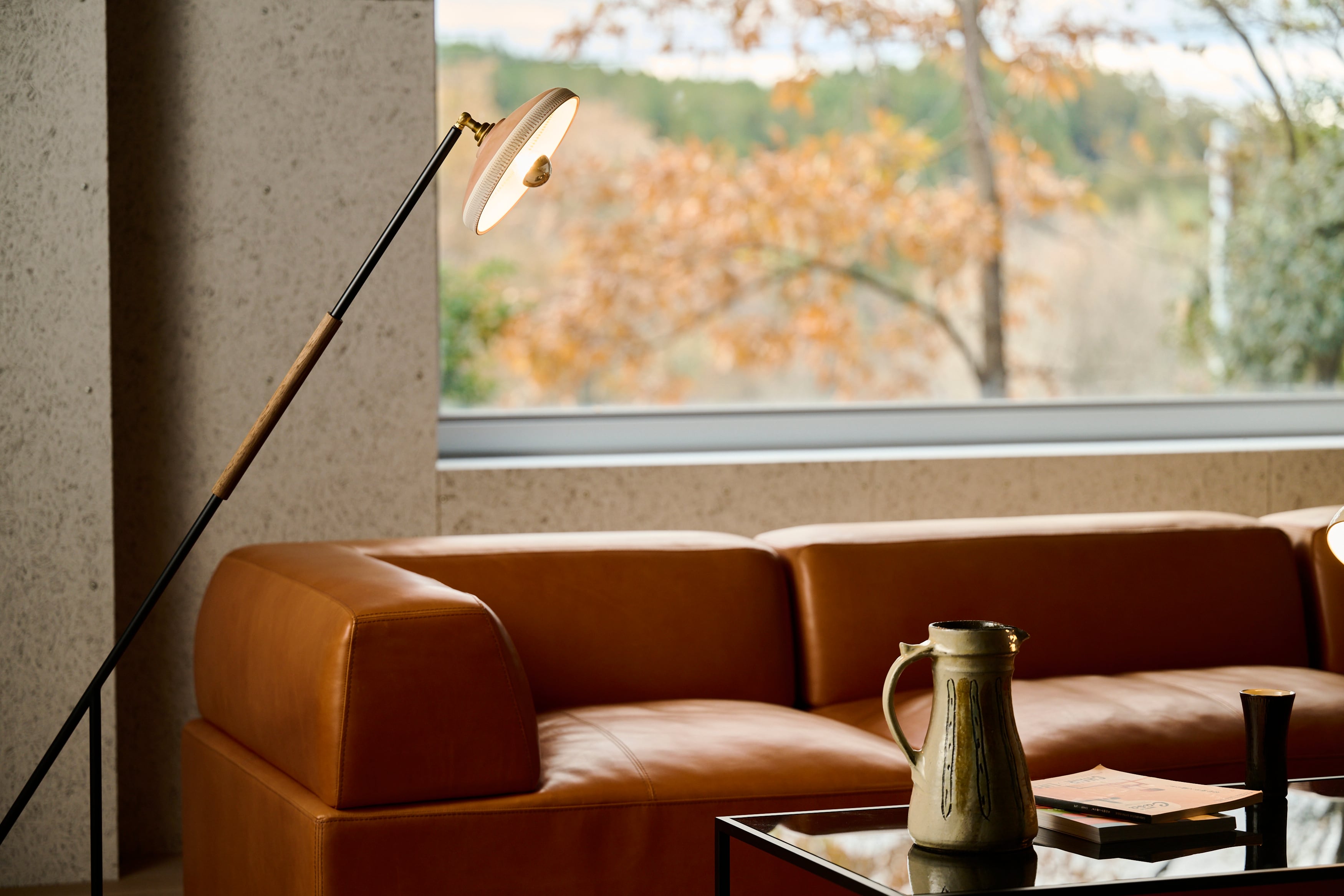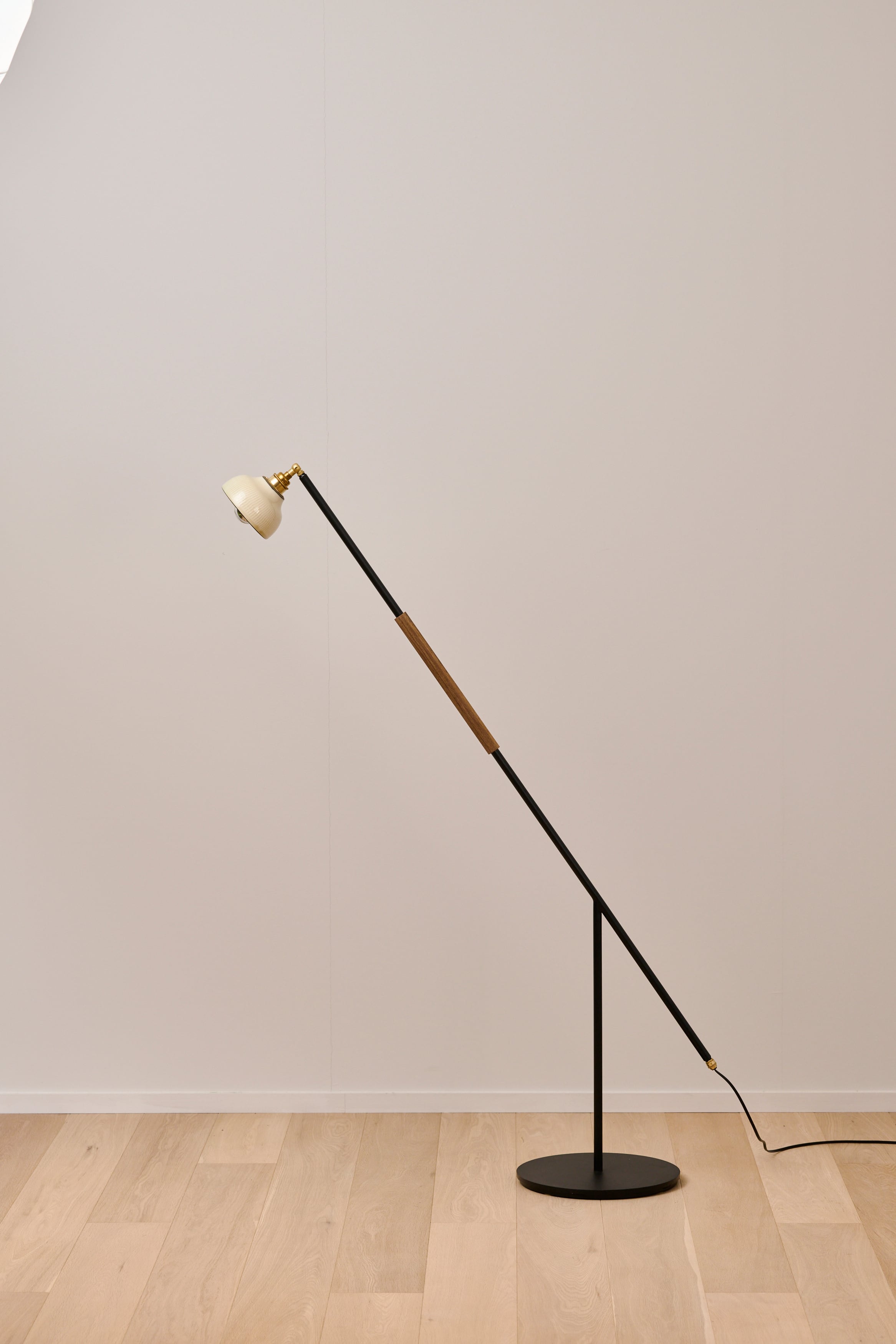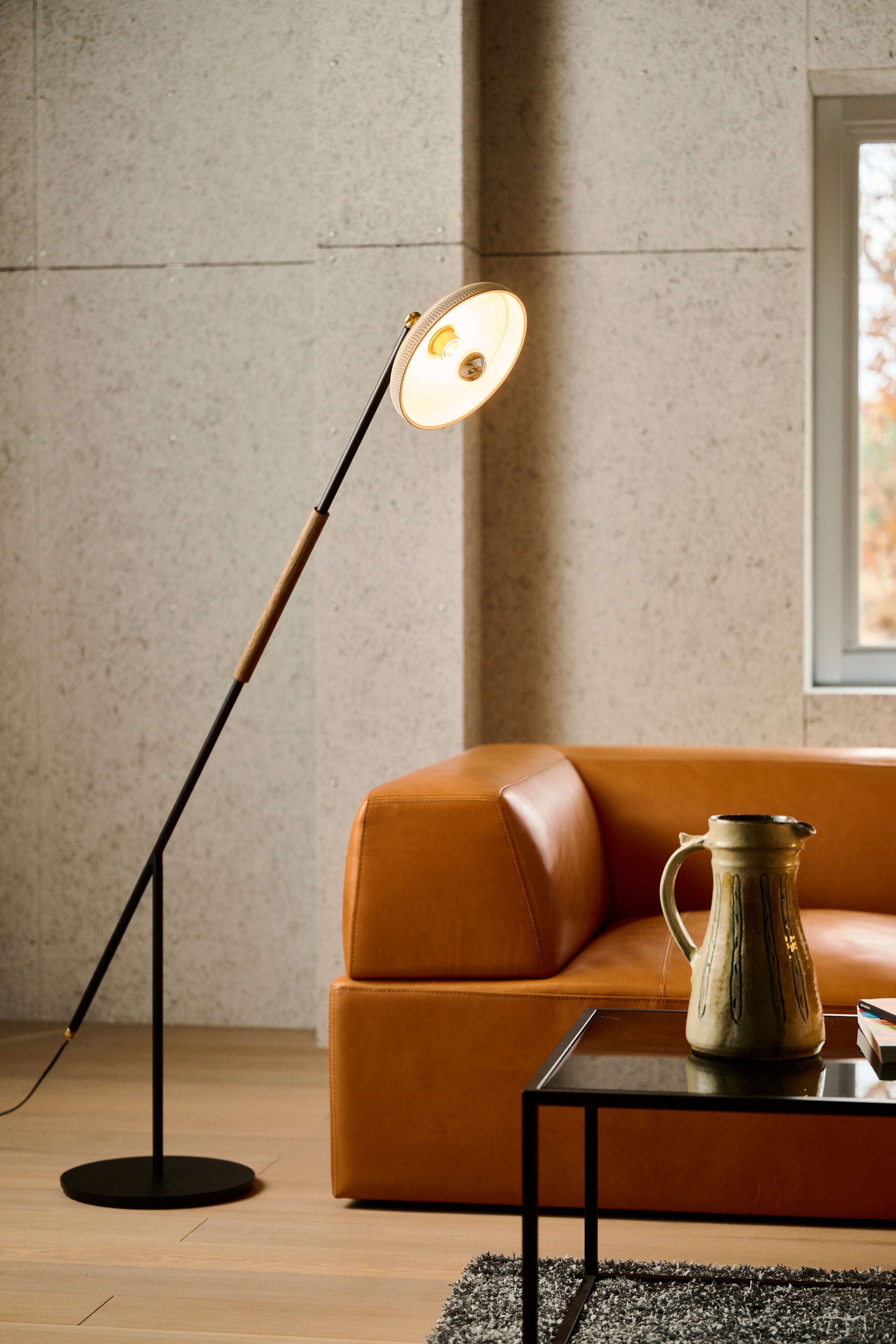 小鹿田焼の唐臼から着想を得たフロアスタンド。照明の灯りを眺めていると唐臼のある小鹿田の風景が思い浮かびます。
