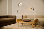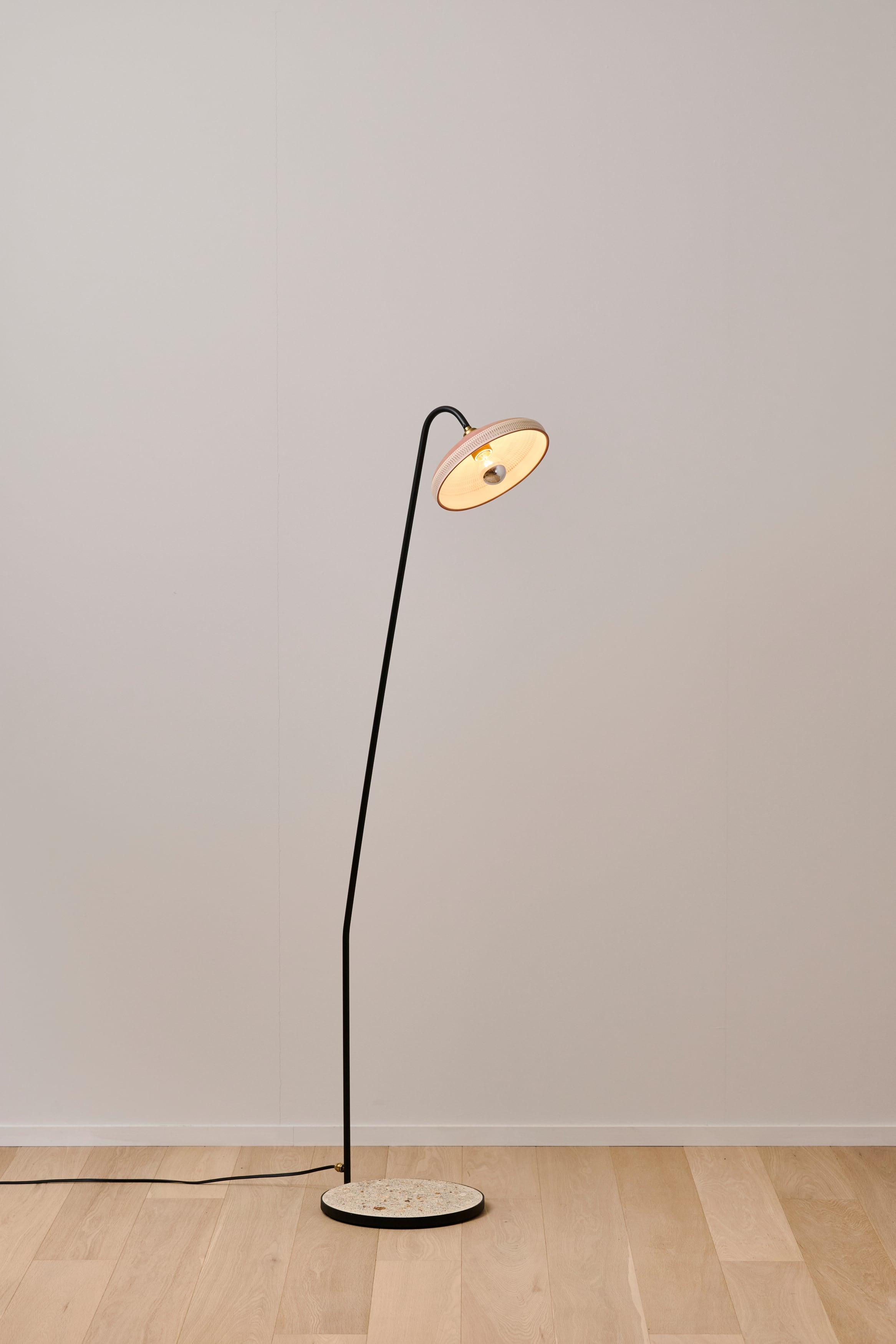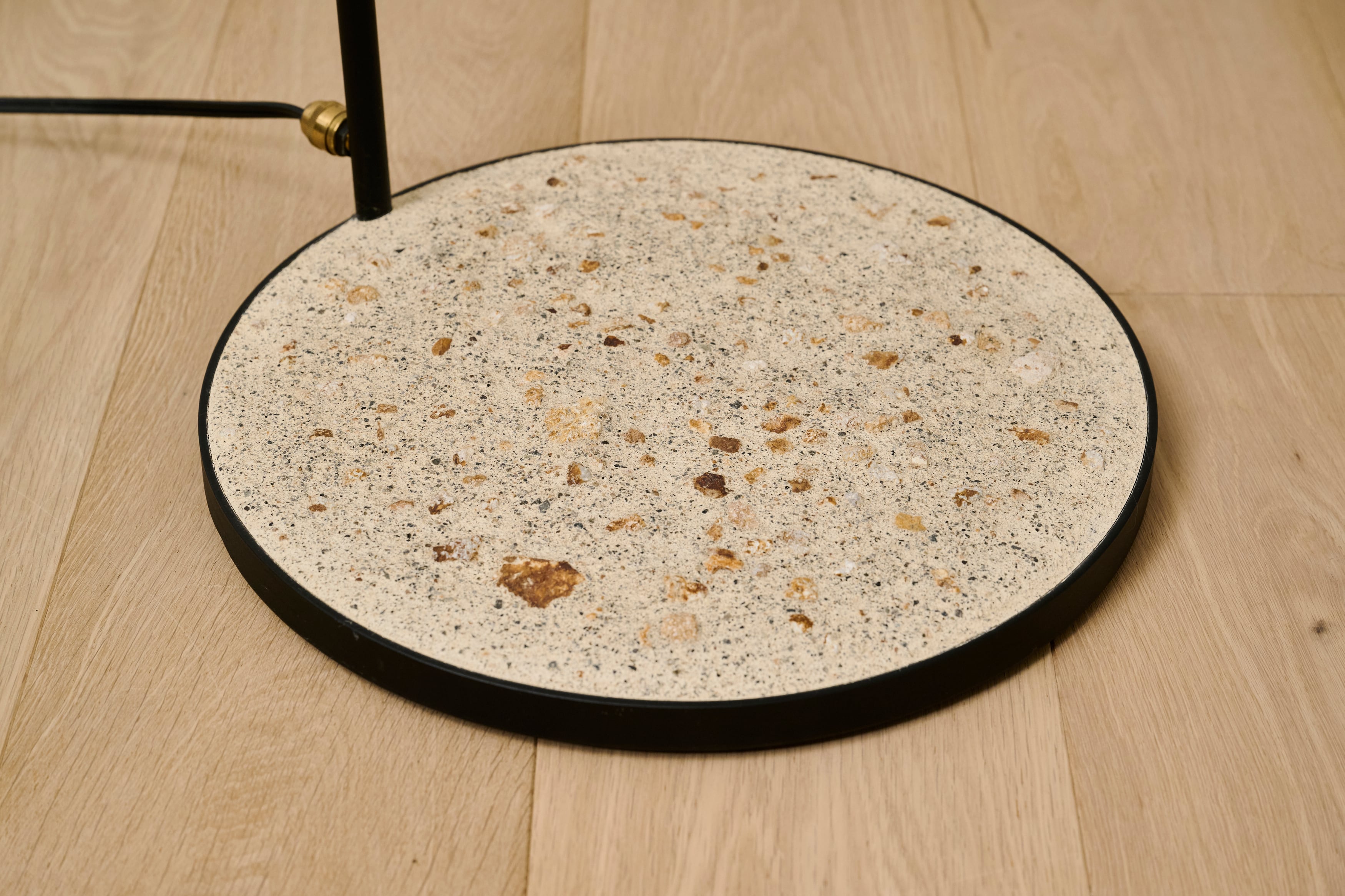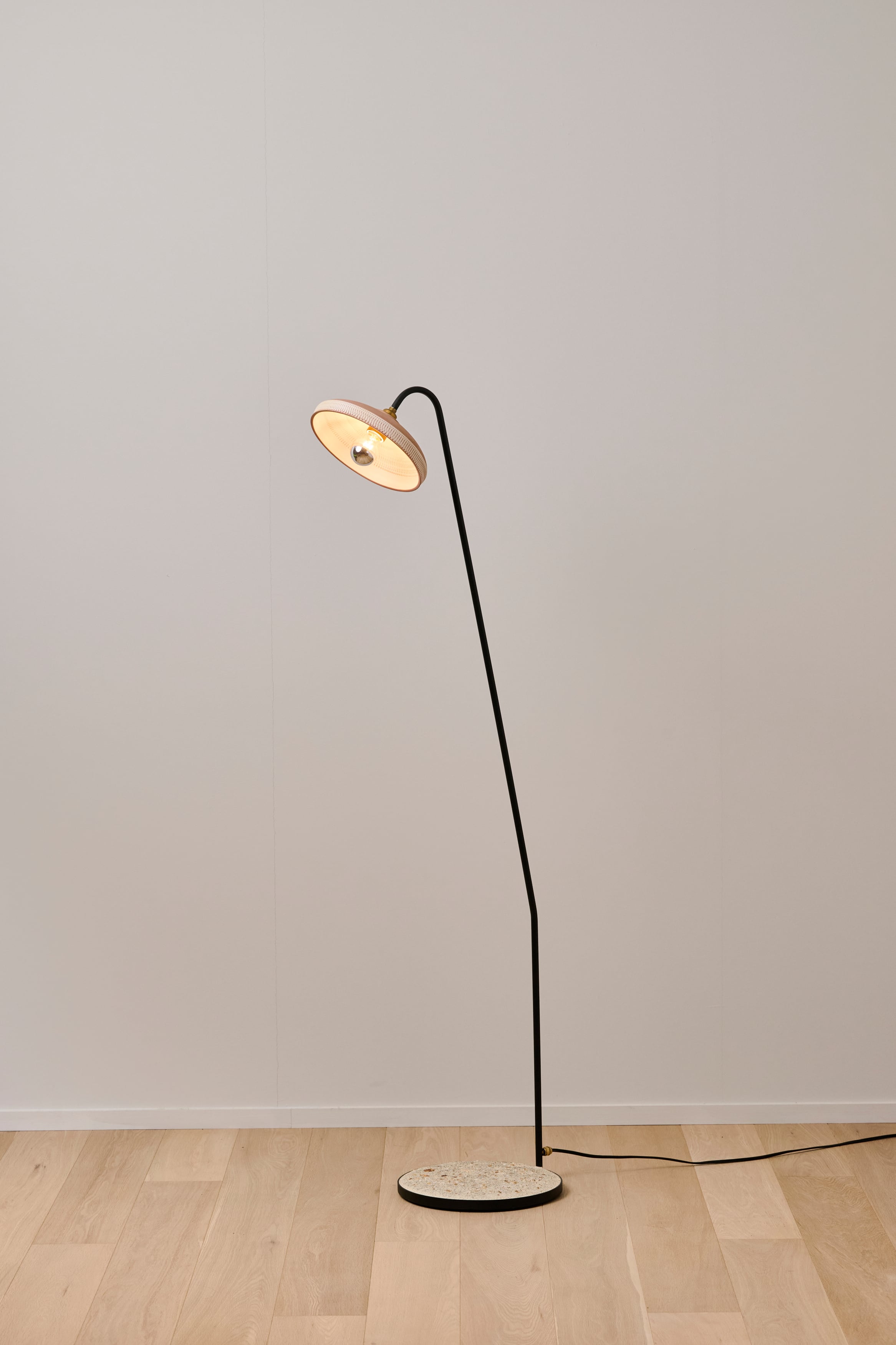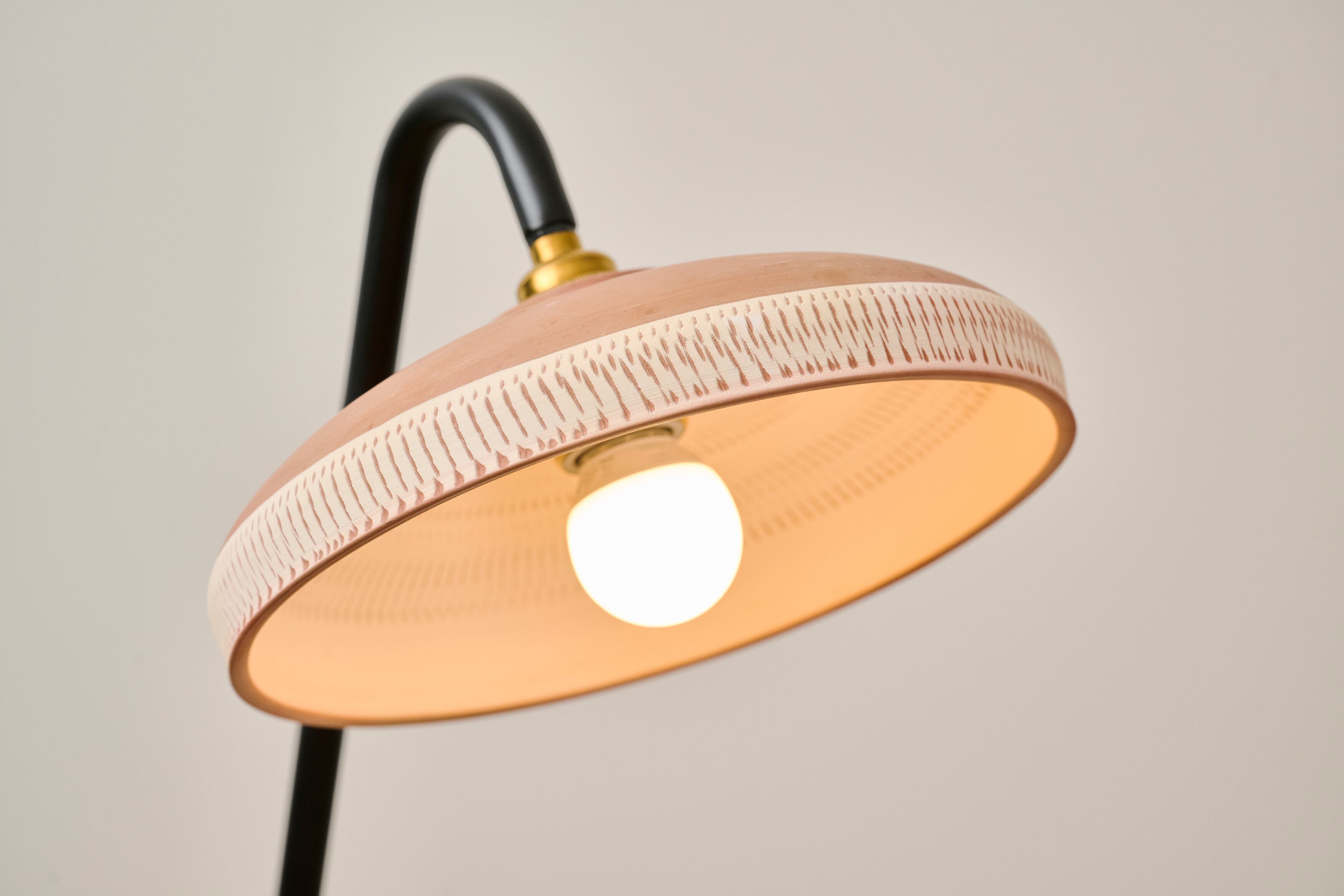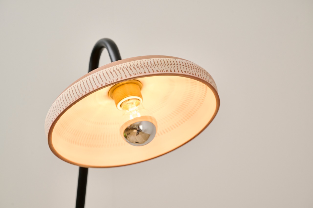 小鹿田焼の唐臼から着想を得たフロアスタンド。鉄の支柱は唐臼の形をイメージして試作を重ねていくうちにシンプルな形にたどり着きました。ライトの台座には唐臼の下にある粉砕された陶土や川の石や小鹿田焼の残土を利用し、左官職人が伝統工法を用いて仕上げの風合いを追求しました。照明の灯りを眺めていると唐臼のある小鹿田の風景が思い浮かびます。