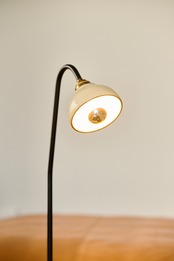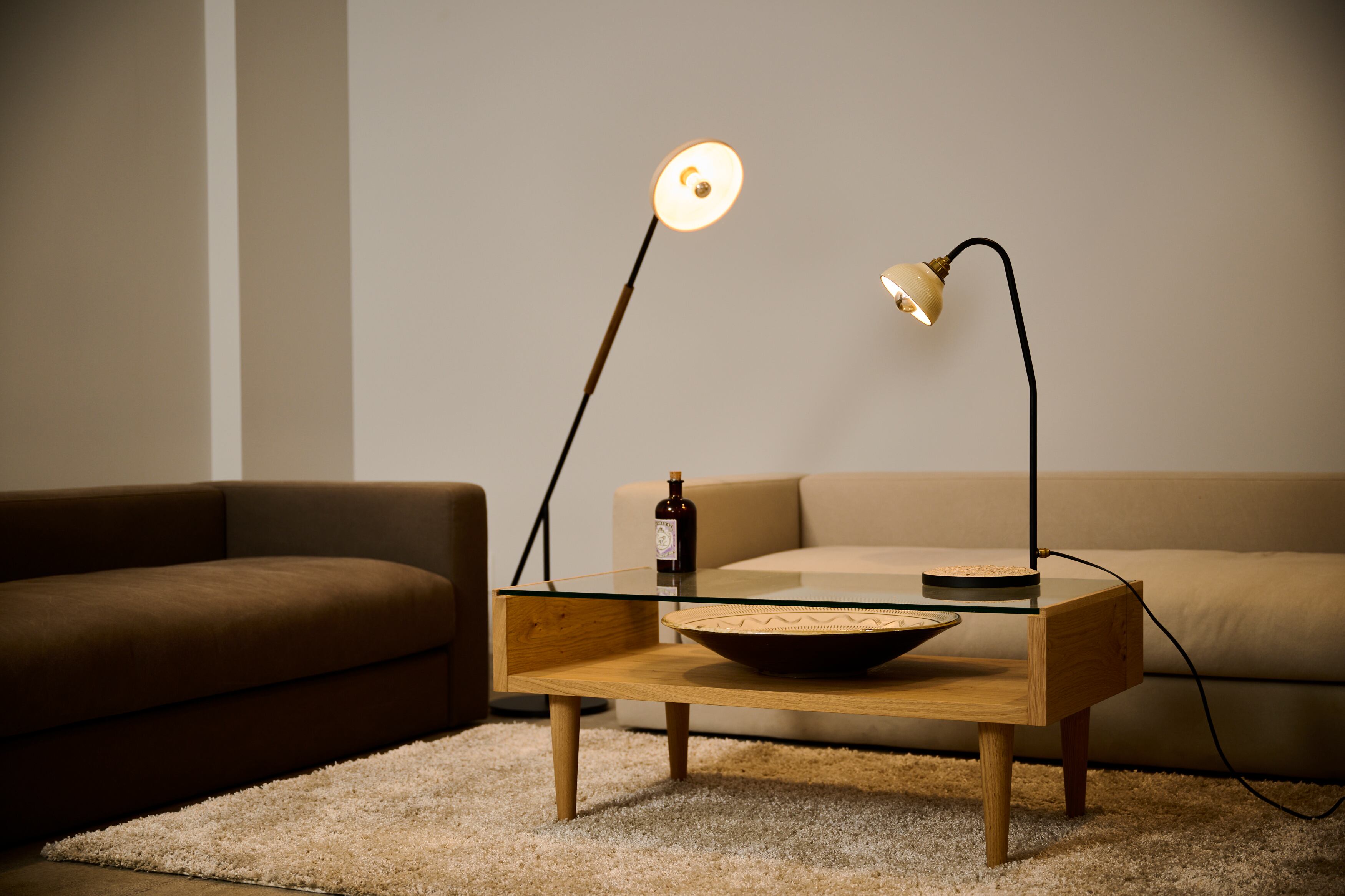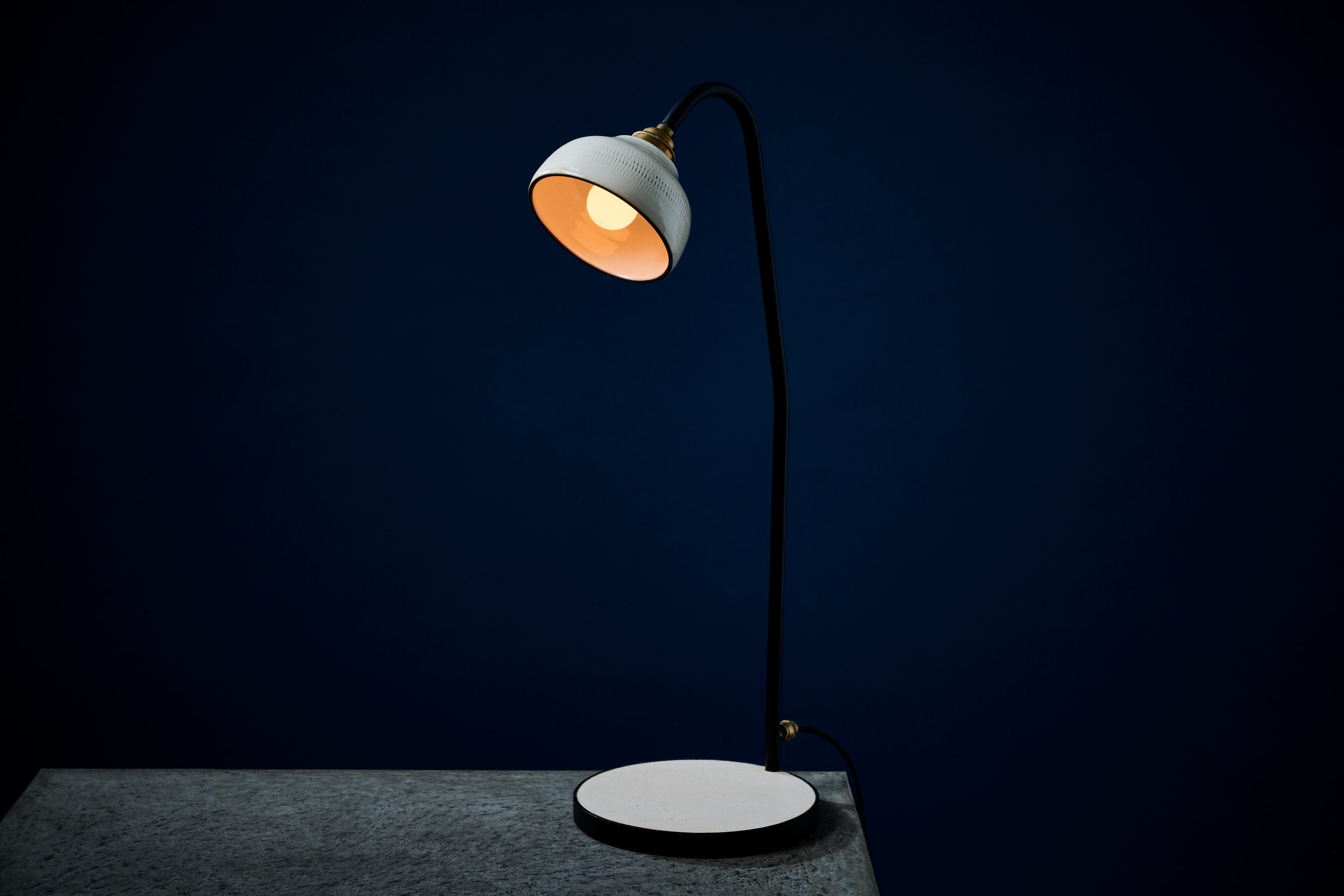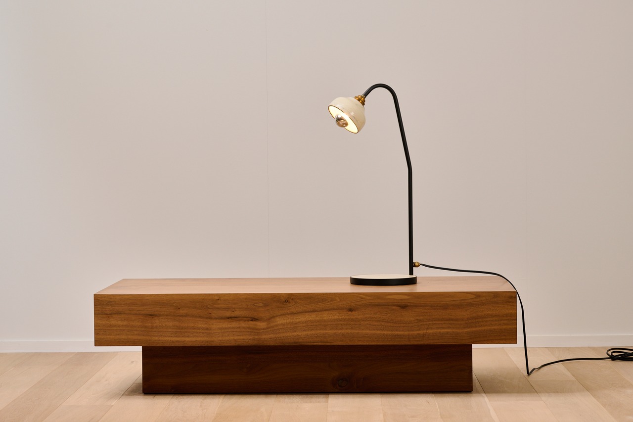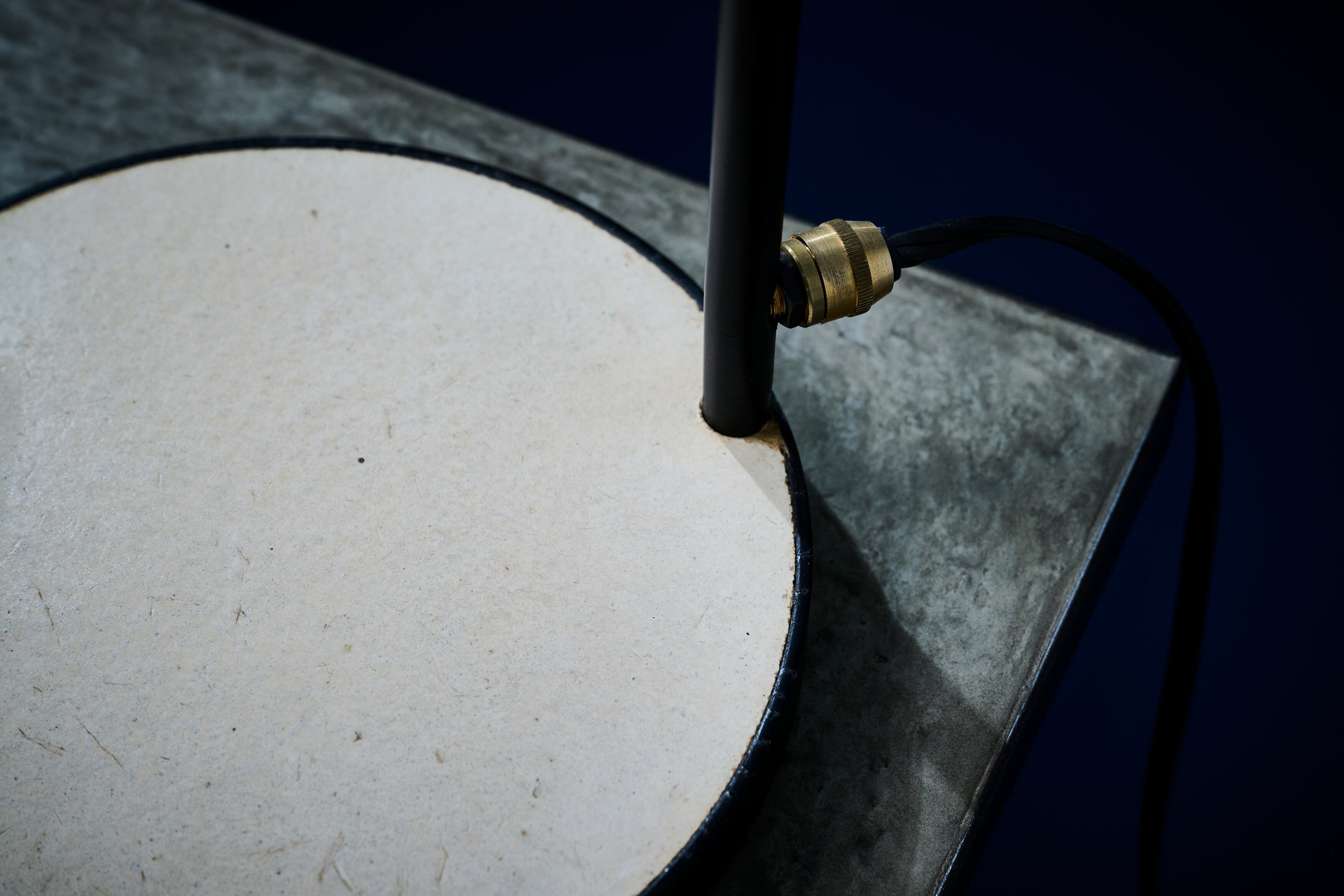 小鹿田焼の唐臼から着想を得たデスクスタンド。鉄の支柱は唐臼の形をイメージして試作を重ねていくうちにシンプルな形にたどり着きました。ライトの台座には唐臼の下にある粉砕された陶土や川の石や小鹿田焼の残土を利用し、左官職人が伝統工法を用いて仕上げの風合いを追求しました。照明の灯りを眺めていると唐臼のある小鹿田の風景が思い浮かびます。